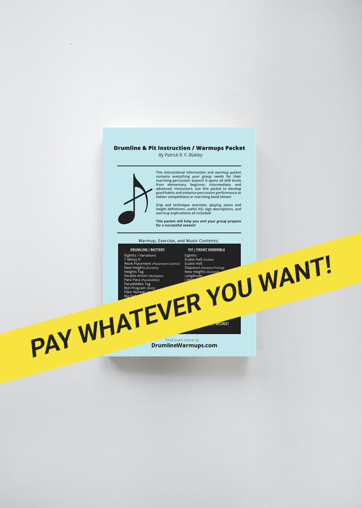If you like these free drumline warmups, take the next step with the complete collection at DrumPacket.com. The Drum Packet is a full percussion program resource where you can download the entire set of warmups plus a detailed technique and instruction outline designed to help you build and organize your drumline, pit, or full percussion section.It includes packet exclusive warmups, expanded exercises, teaching descriptions, and rehearsal ideas that show you how to actually implement the material with your group. The best part is that you choose the price!Pay whatever you want and get a complete drumline warmup packet that gives you structure, ideas, and practical tools you can start using at rehearsal immediately.